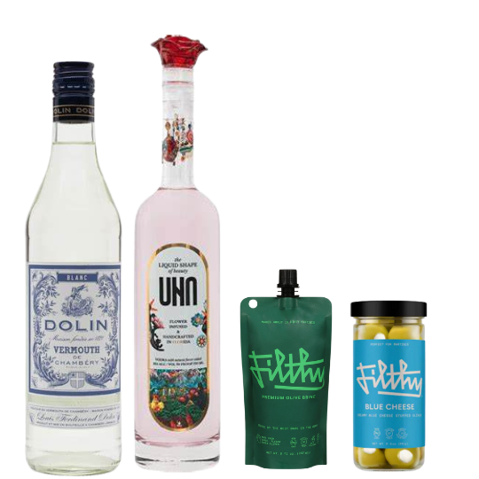 This custom box includes one bottle of Dolin Blanc Vermouth (750ML), one bottle of Una Flower-Infused Vodka (750ML), one jar (8.5oz) of Filthy blue cheese olives, and one pouch (8oz) of Filthy olive brine.